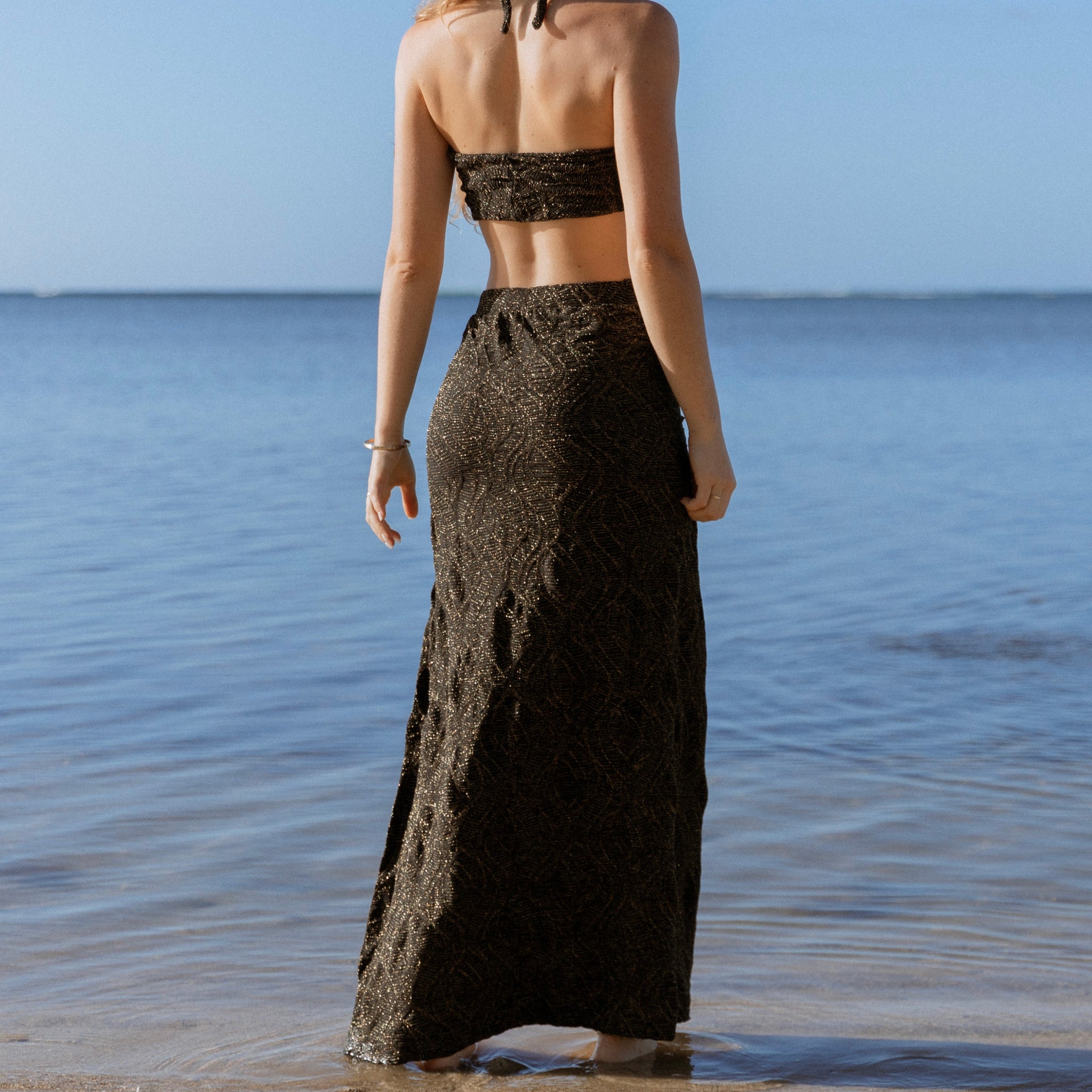 • Load image into Gallery viewer, Mallorca Black Sparkling Macrame Long Skirt