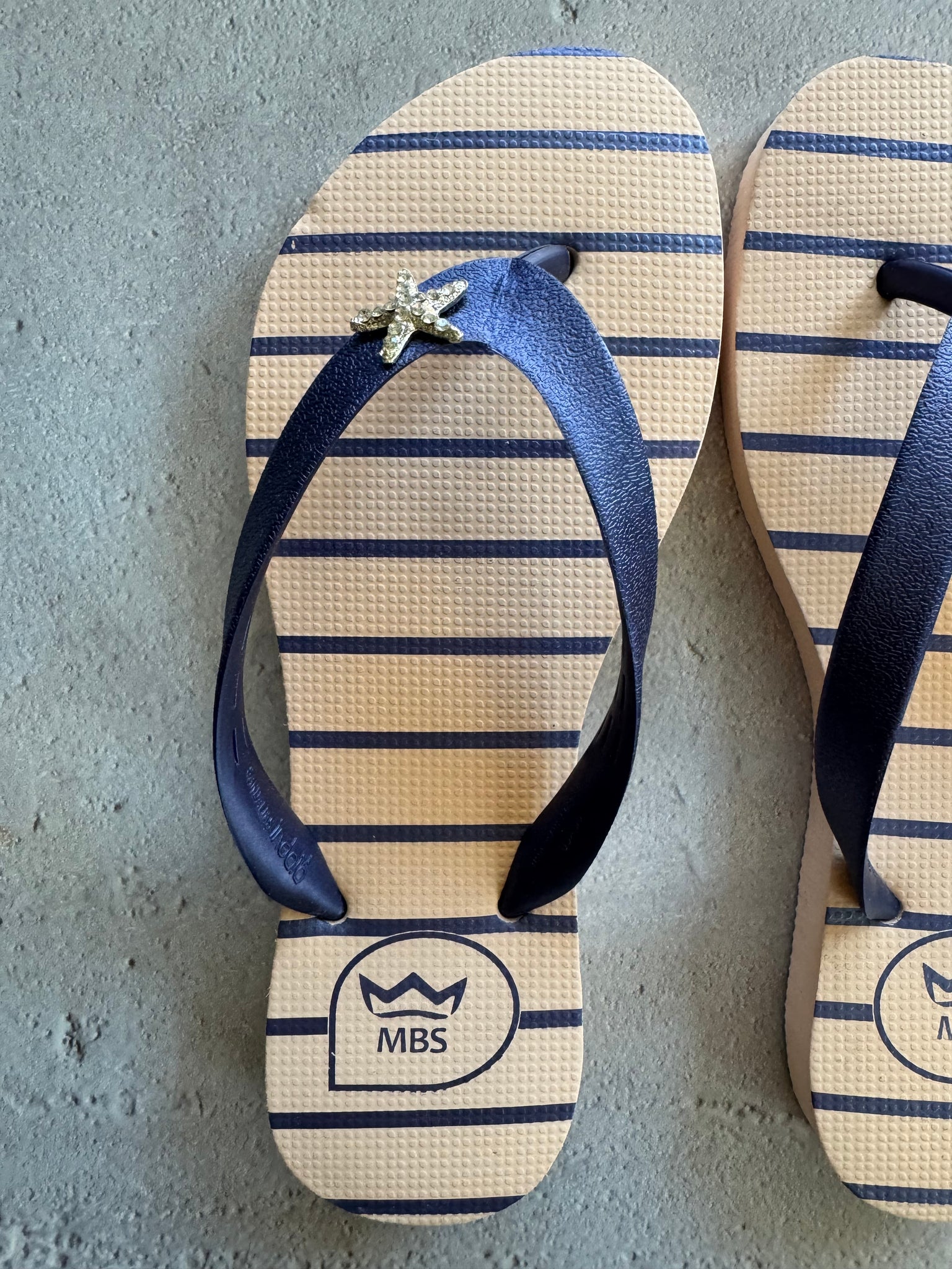 • Load image into Gallery viewer, Nude and Blue Striped Star Flip Flops